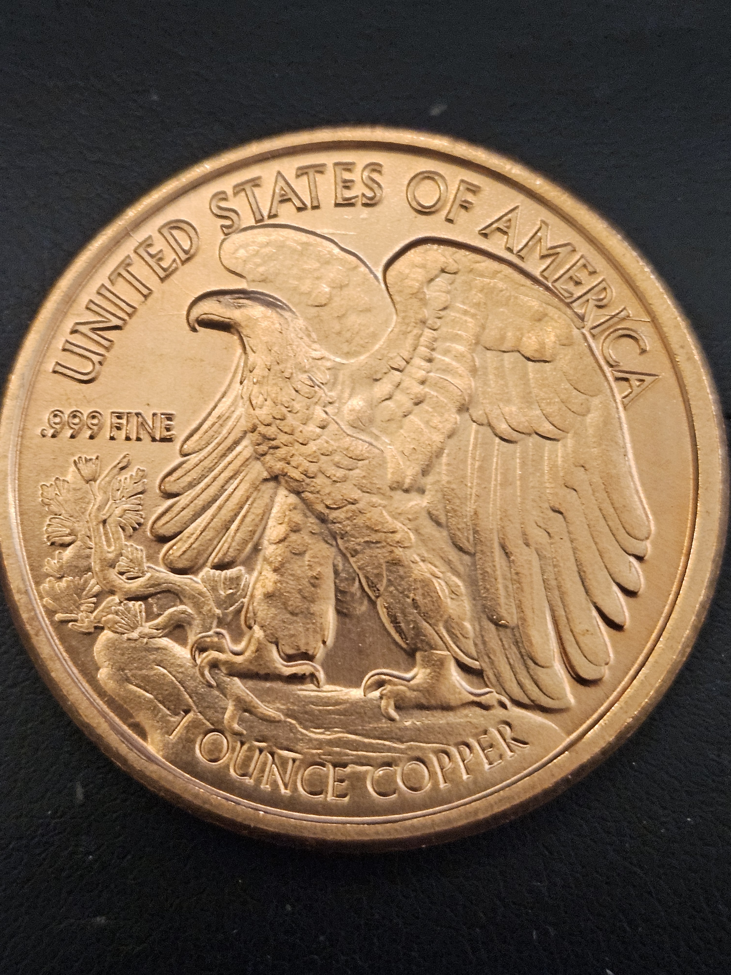 This bullion round is made from 1 Ounce of .999 pure copper, and was struck with the Walking Liberty design from old United States Half-Dollars.