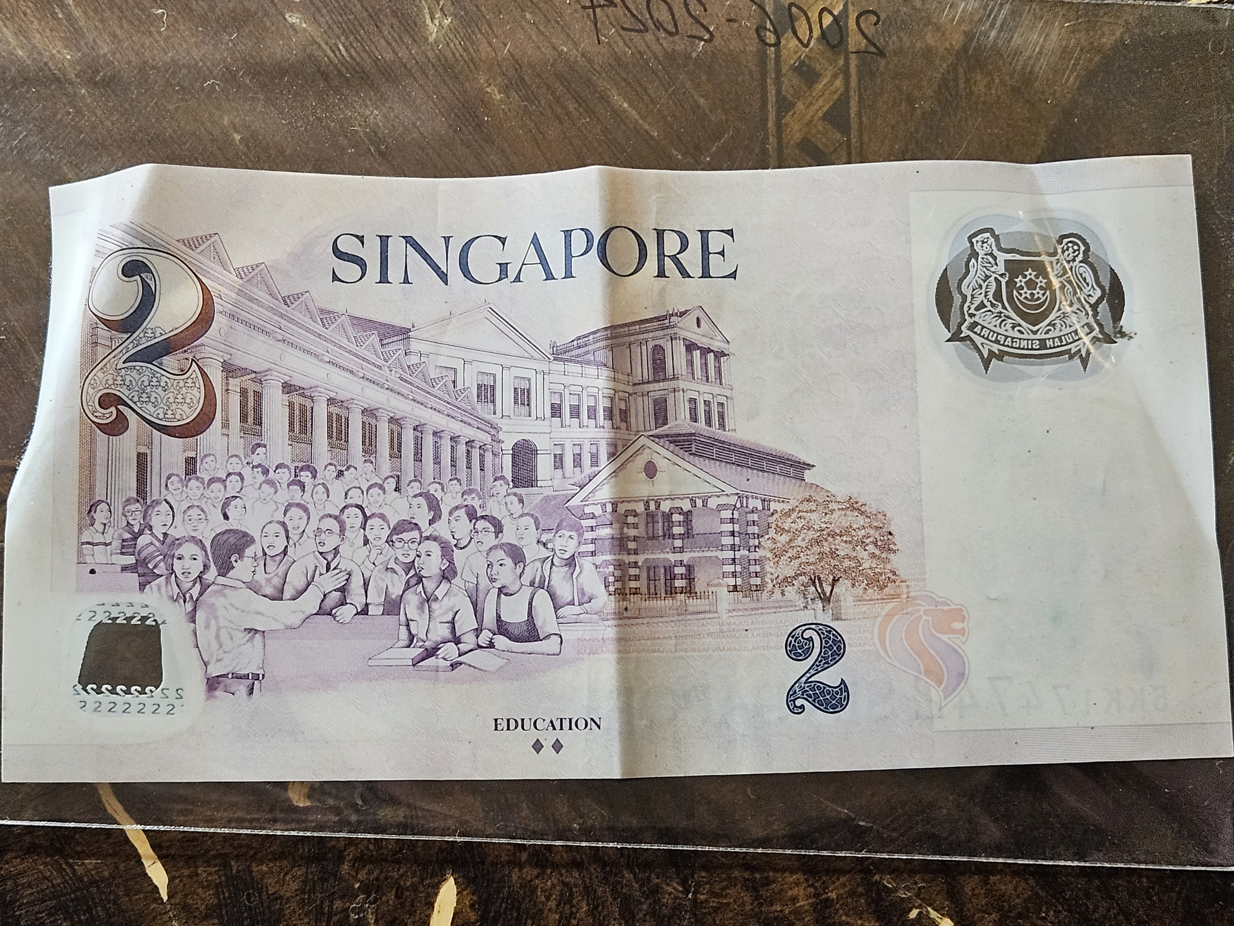 This bank note from Singapore features a material not commonly used in bank notes - a type of polymer plastic, with see-through windows in the top and bottom corners. The Obverse Side depicts the first President of Singapore, Yusof bin Ishak, and the Reverse side design depicts people learning in a classroom besides a large school or other educational institution.