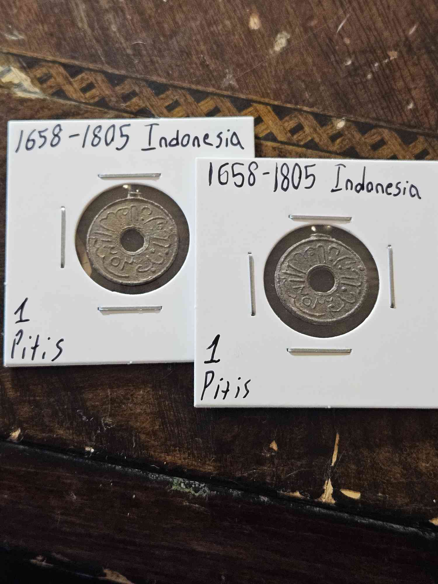 These tin coins were used as a low-value everyday circulation coin in the Indonesian Sultanate of Palembang, anywhere between 220 and 367 years ago! With some translation, you could even figure out the exact year or leader who was in charge when they were made!