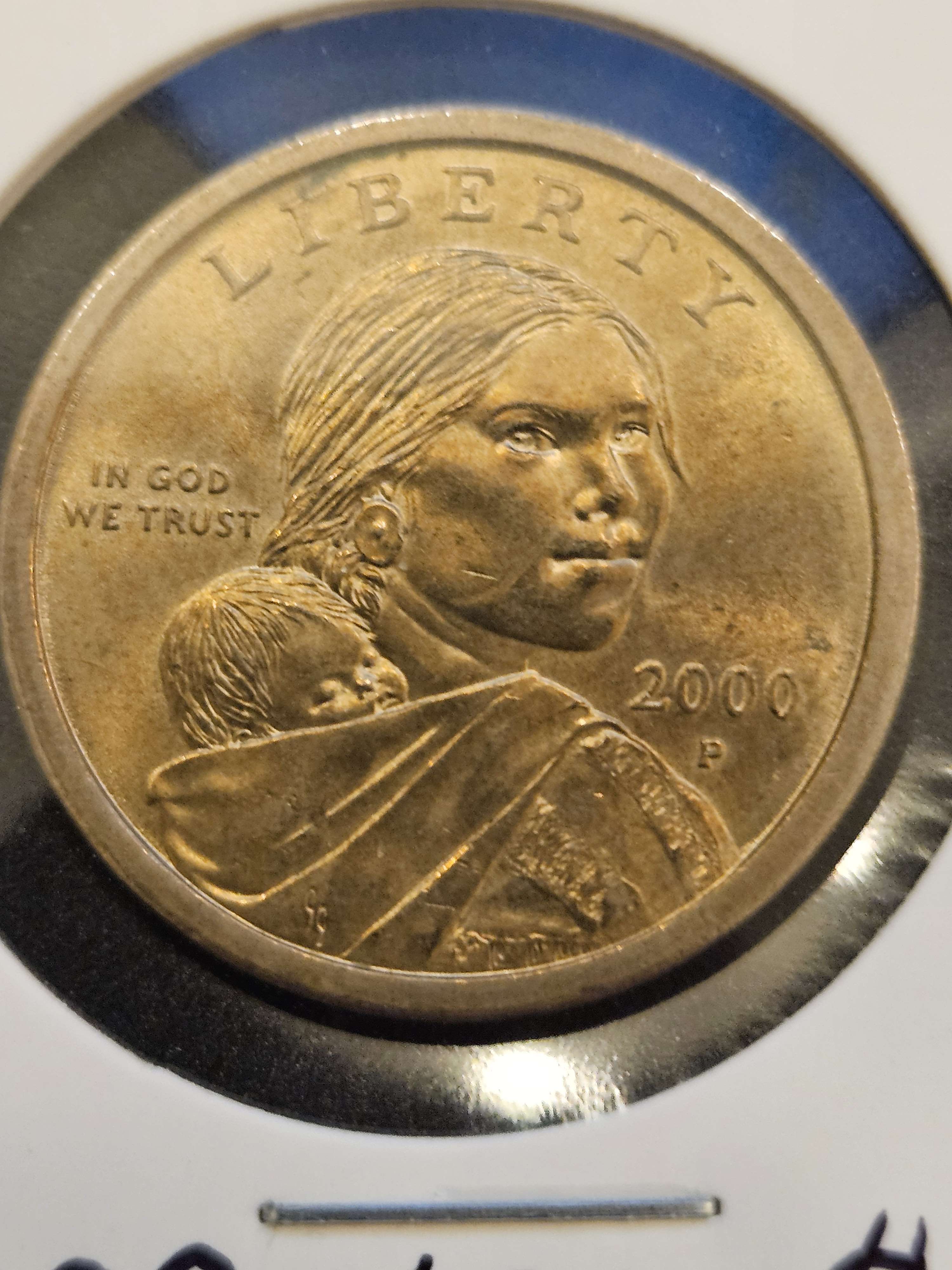 This $1 coin was made in 2000 at the Philadelphia Mint. The Obverse side design features the Native American woman Sacagwea, carrying her infant son Jean Baptiste on her back. She was responsible for assisting the Lewis and Clark Expedition team as a translator and guide and is honored on this coin over 200 years later.