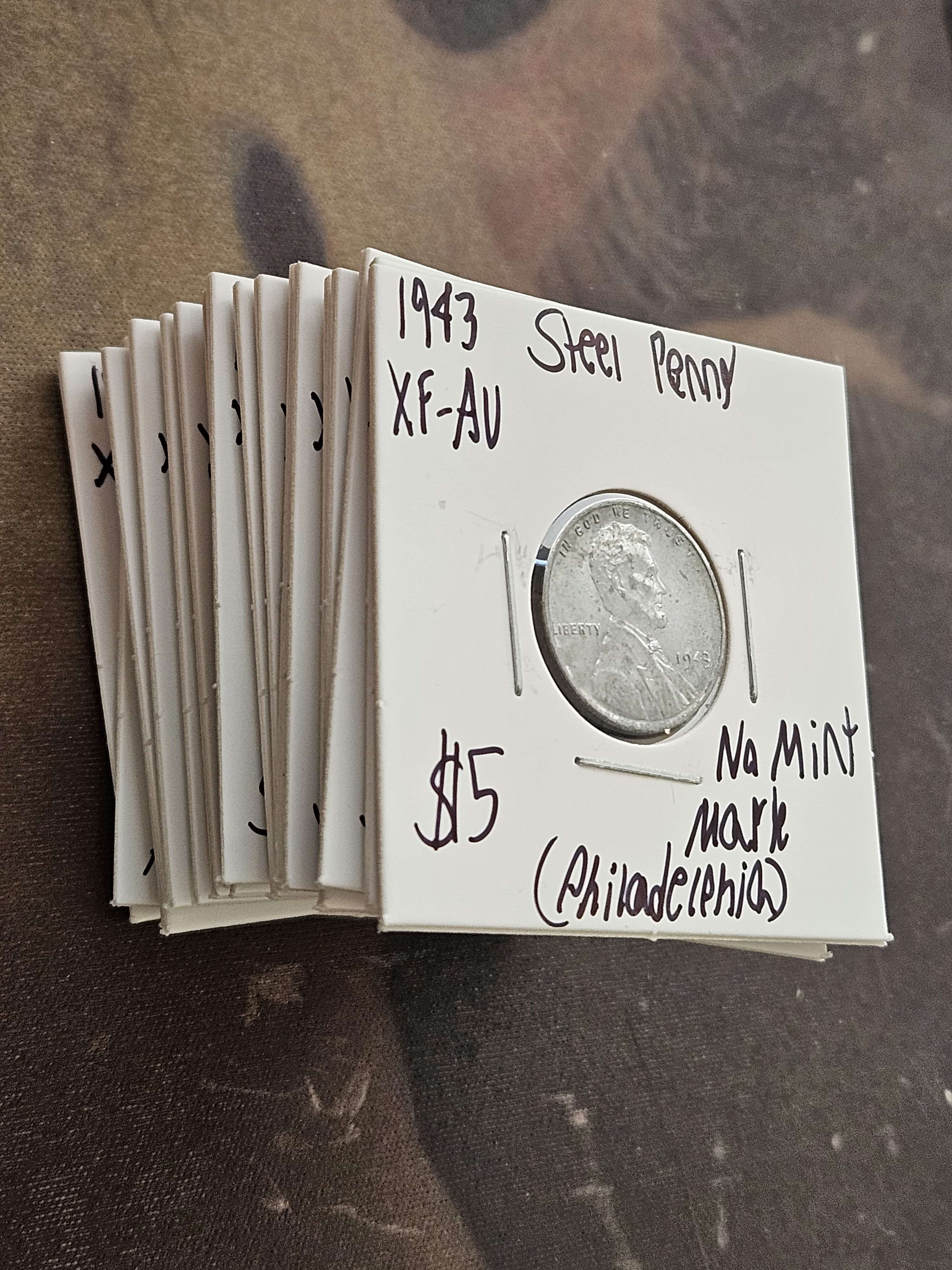 Steel pennies such as this were made during World War II, in 1943, at the Philadelphia Mint. The United States government ordered the US Mint to create Lincoln Cents out of steel so that the copper and bronze could be used for ammunition, artillery shells, and bombs. These ones are in Extremely Fine to About Uncirculated condition, unprofessionally graded by me.