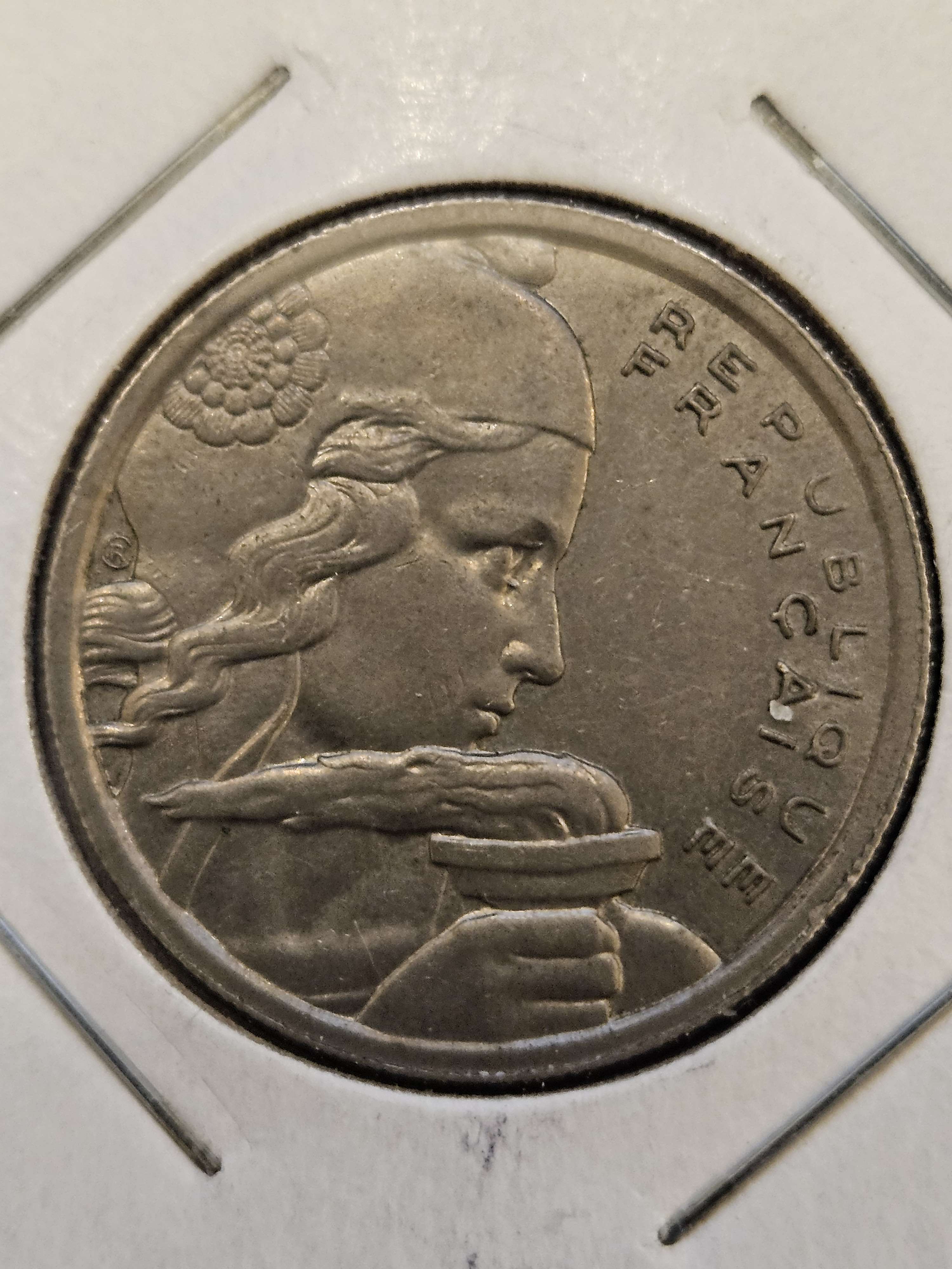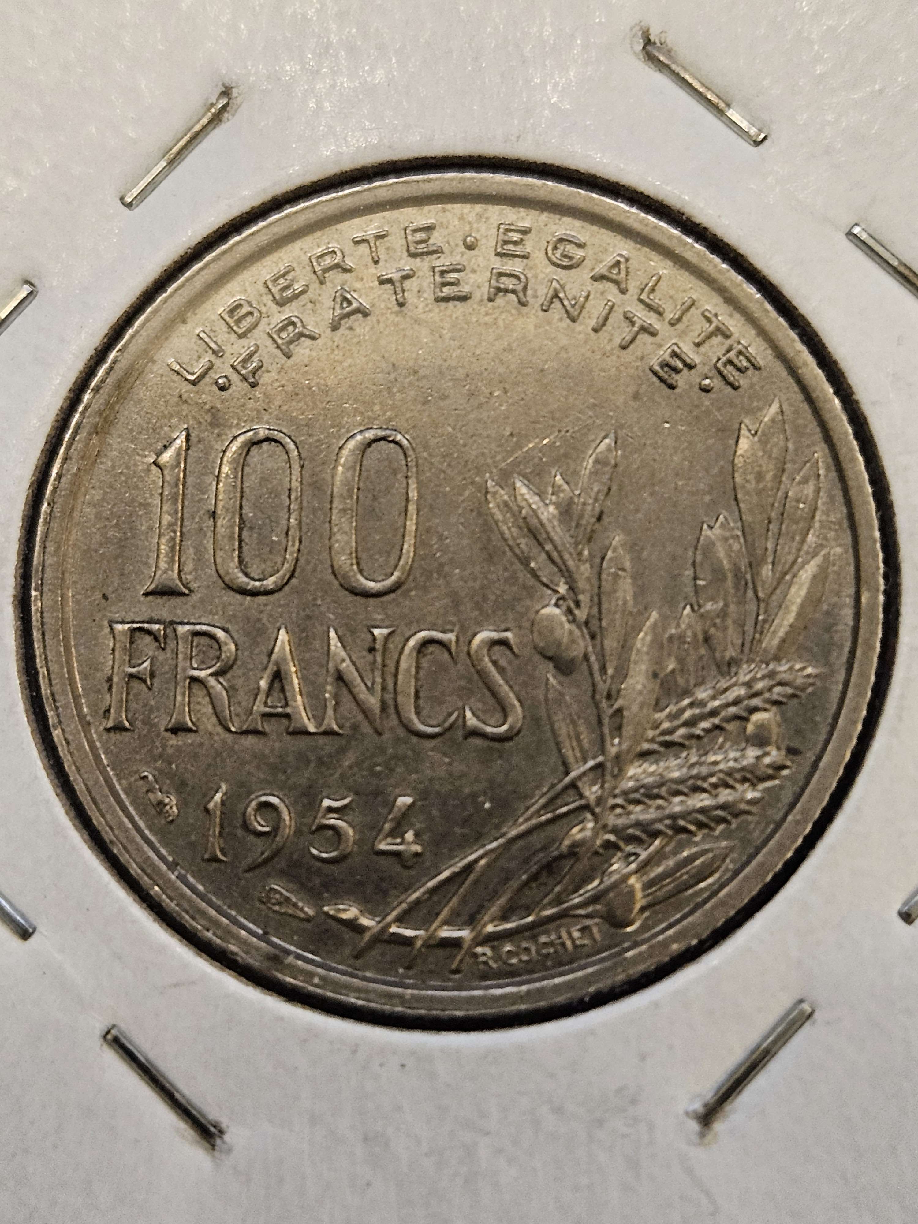 Unprofessionally graded by the person I got it from. About Uncirculated 55 - Minted in France in 1954. The Obverse side design of this 100 Francs coin features Marianne, the national Personification of the French Republic, holding a torch and seeming determined to reach a goal before her. The Reverse side design features the value of the coin stated next to some stalks of wheat and olive branches.
