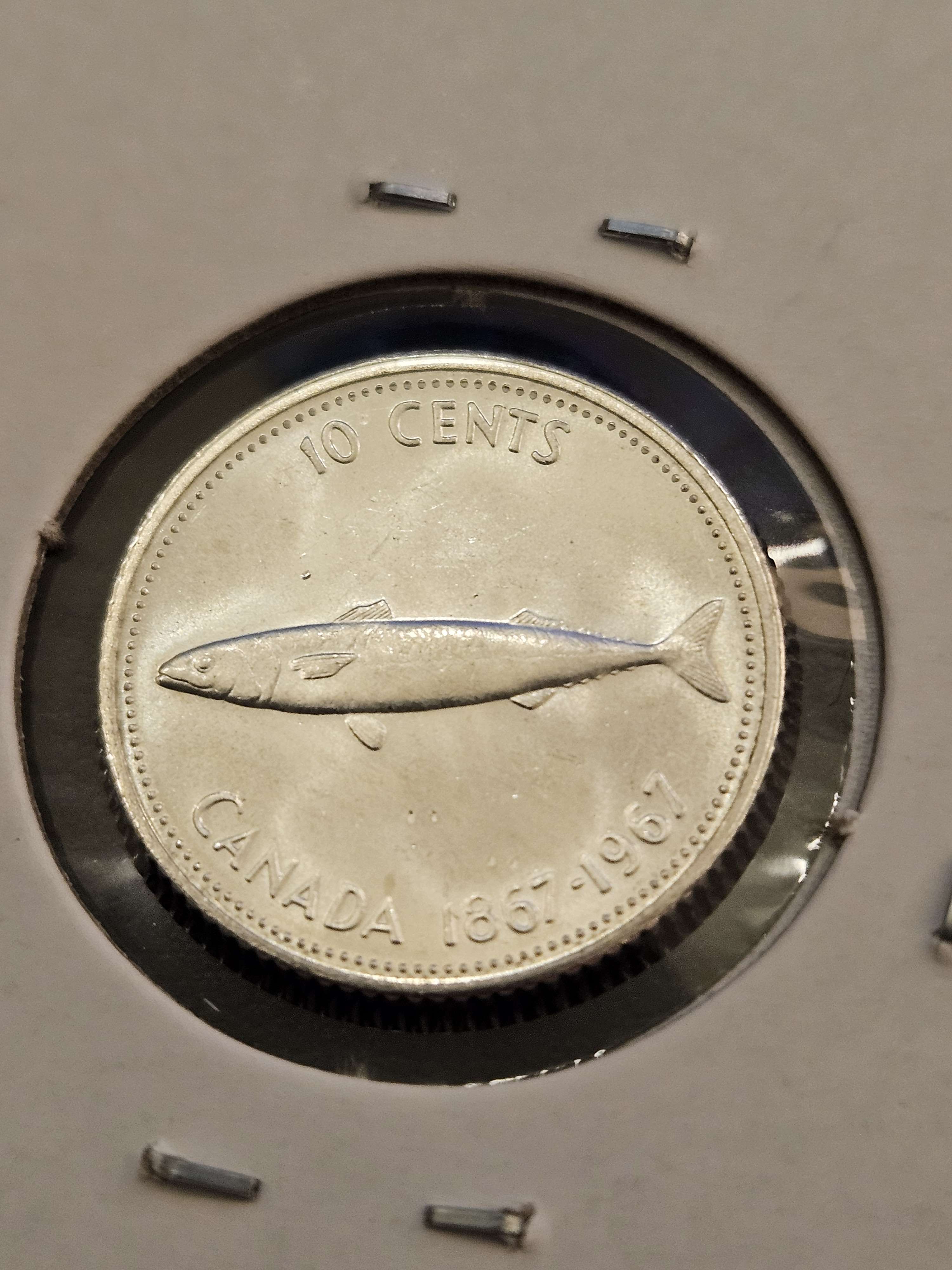 This commemorative Proof from 1967 is made out of up to 80% silver, and was made as a proof-only issue, meant to be entirely uncirculated. The Obverse side features Queen Elizabeth II in her 30s, her Second Portrait. The reverse side features a Mackerel, the date Canada was founded, and the date the coin was minted. The coins were minted specifically to celebrate Canada's 100th anniversary, the Centennial! Unprofessionally graded by me at PF60.