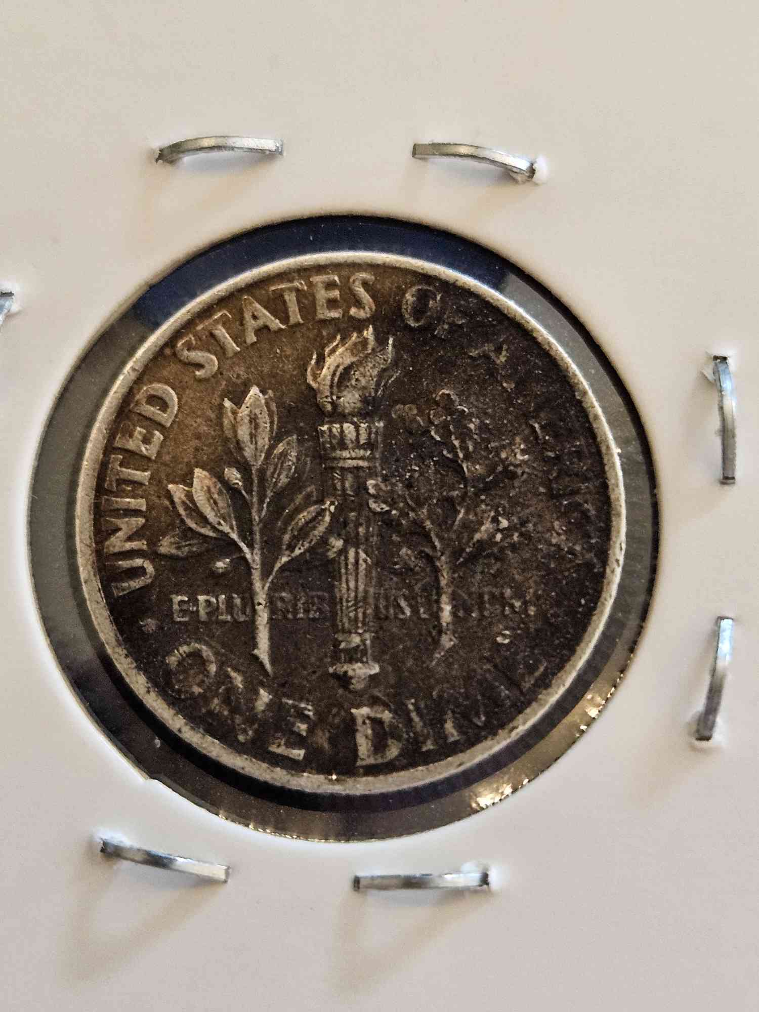 Unprofessionally graded by me. This Roosevelt Dime was made at the Philadelphia Mint in 1964, and is made out of an alloy of 90% silver and 10% copper. The Reverse side shows signs of being burned, either in a fire or by some punk with a lighter. The coin has multiple signs of being scorched by flames, but the Obverse side is relatively untouched, aside from some clear toning across the surface. The grade sits somewhere between Extremely Fine and About Uncirculated, with the upper bands on the Torch of Freedom being fully separated while the lower bands have been worn down.