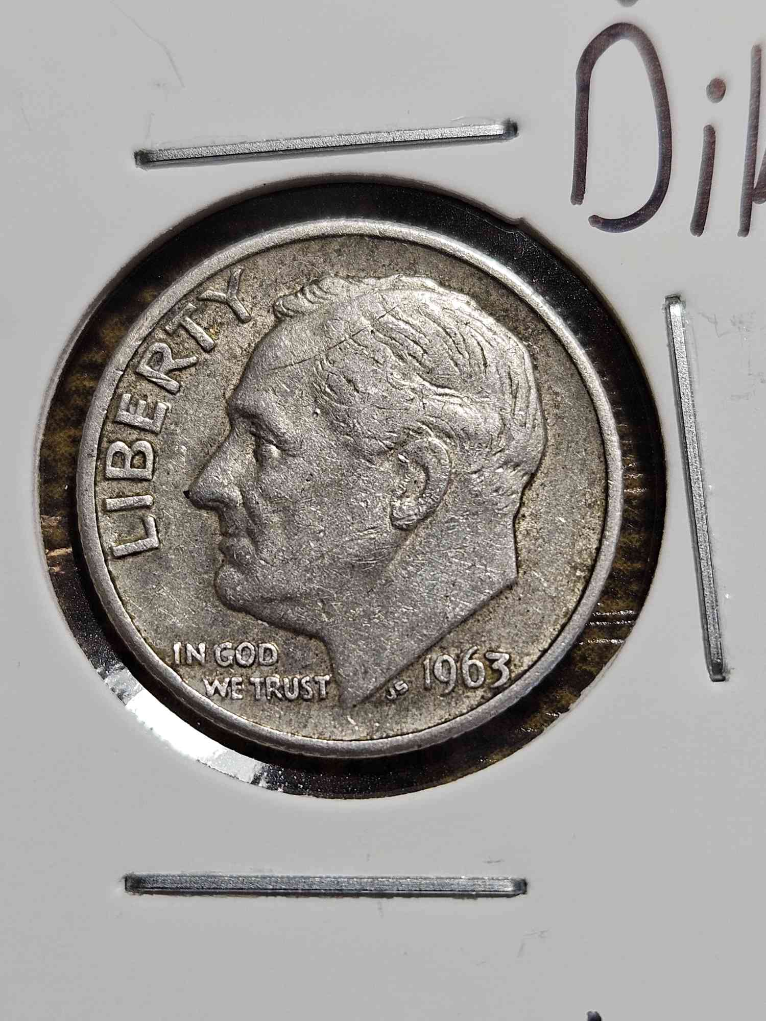 This Roosevelt Dime was minted in 1963 at the Denver Mint and was unprofessionally graded by me. Features Franklin Roosevelt on the Obverse and the Torch of Liberty on the Reverse.