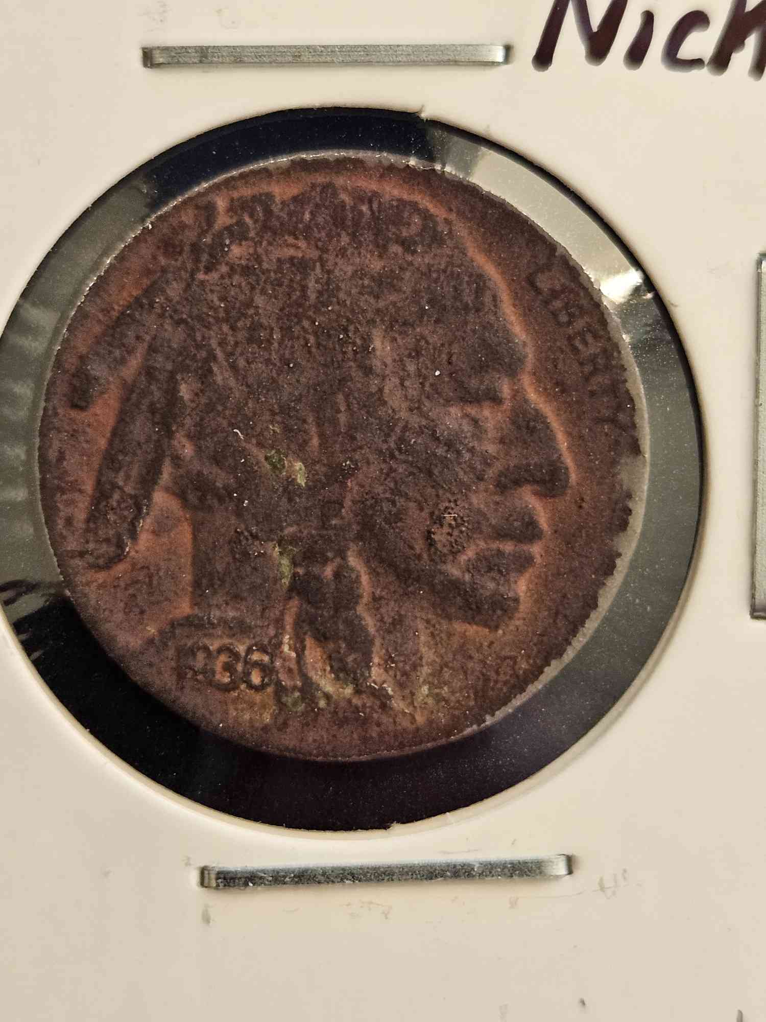 This Buffalo Nickel was minted in 1936, The Mint is unknown. I found this in the reject cup at my local supermarket, which contained things rejected by the self-checkouts and Coinstar machine. Someone tried using this to spend with, but now it can be yours to keep and display.