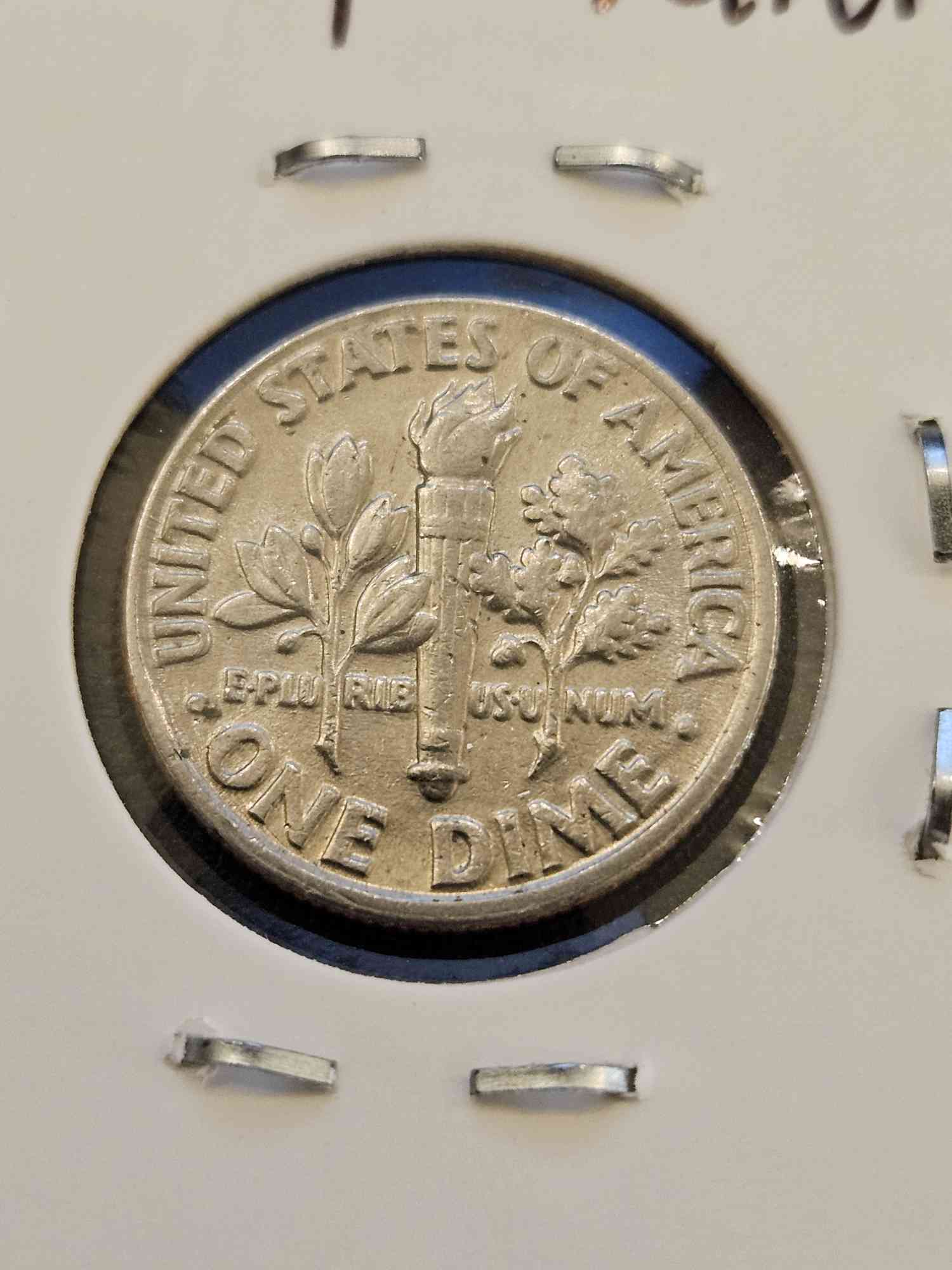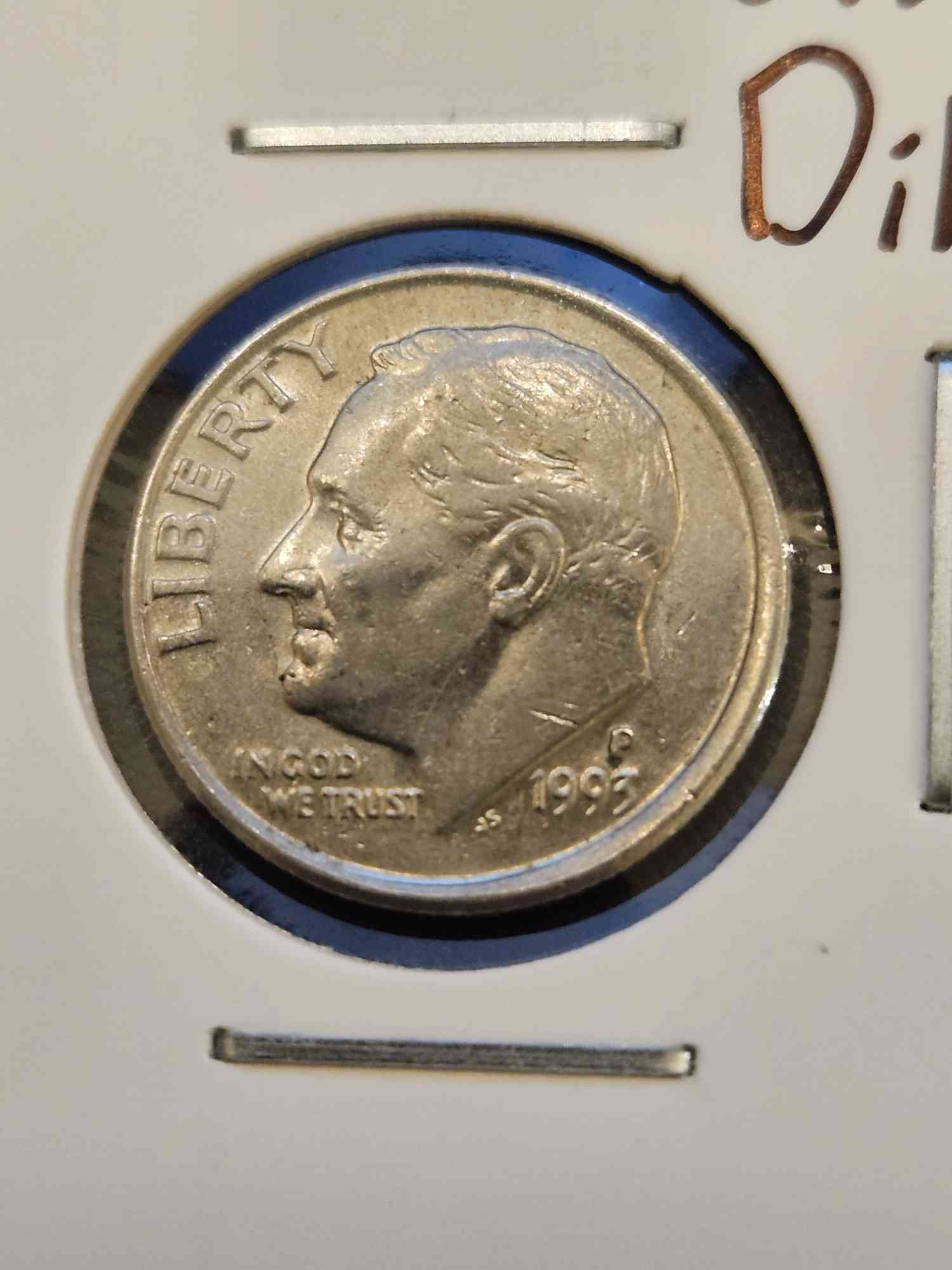 This Roosevelt Dime, minted in 1993 at the Philadelphia Mint, was struck very slightly off-center, which is noticeable on the Obverse side, but most noticeable on the Reverse side, which is missing part of the outline on the edge.